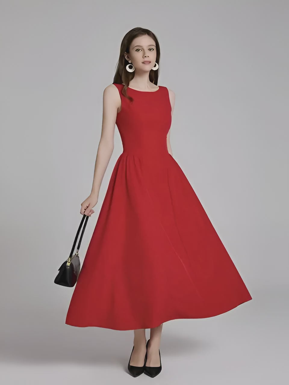 Sleeveless midi dress in a structured fabric with a clean neckline and fitted bodice. Designed with waist shaping and a flared skirt for volume and movement. Minimal and polished for an easy occasion look with heels or flats.